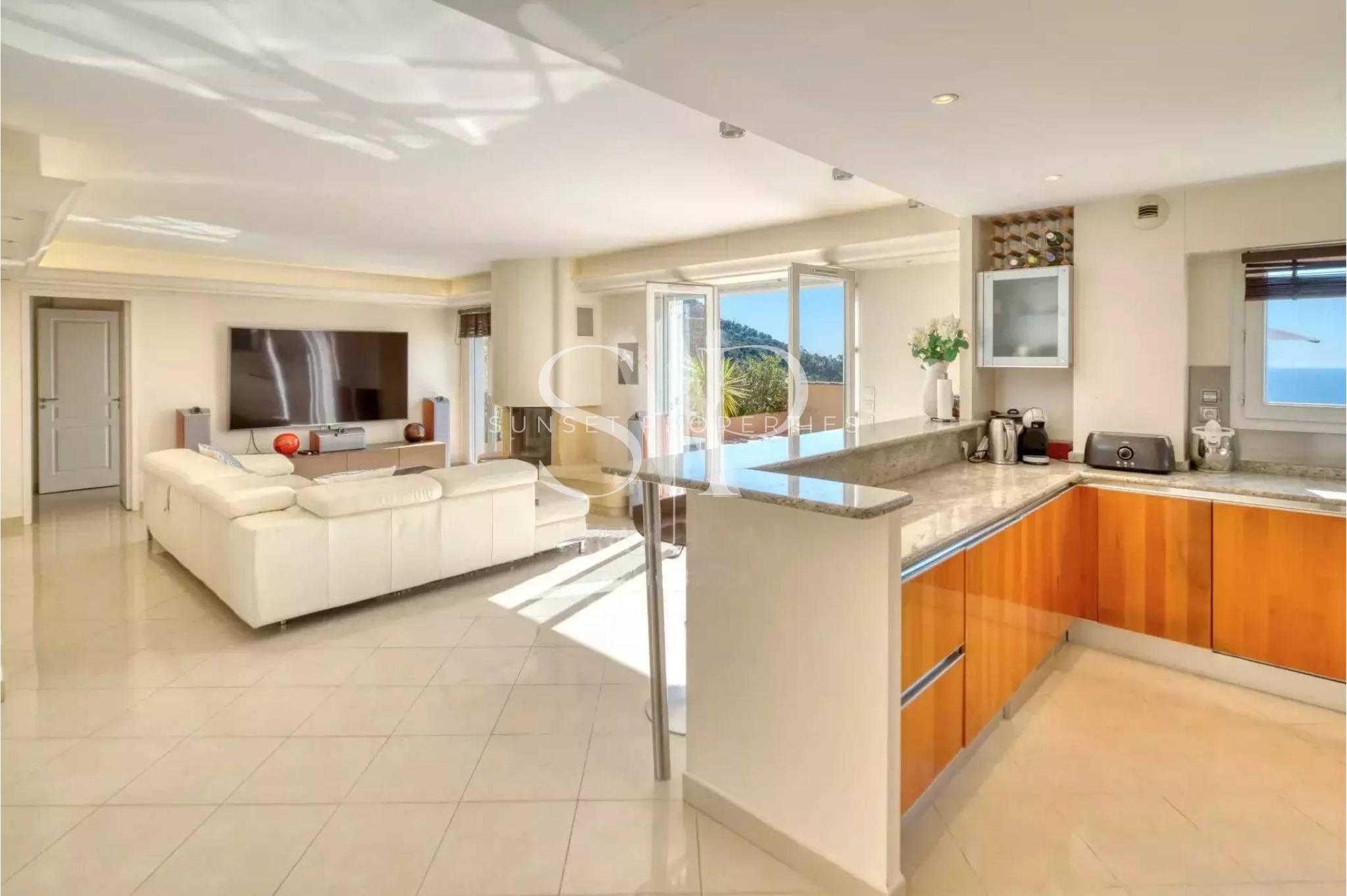 A l’entrée, vous bénéficierez d’un agréable séjour avec une véritable cheminé à insert et une cuisine ouverte totalement équipée. Le tout donne sur une vaste terrasse de 110 m² avec une vue mer panoramique, sans aucun vis à vis.